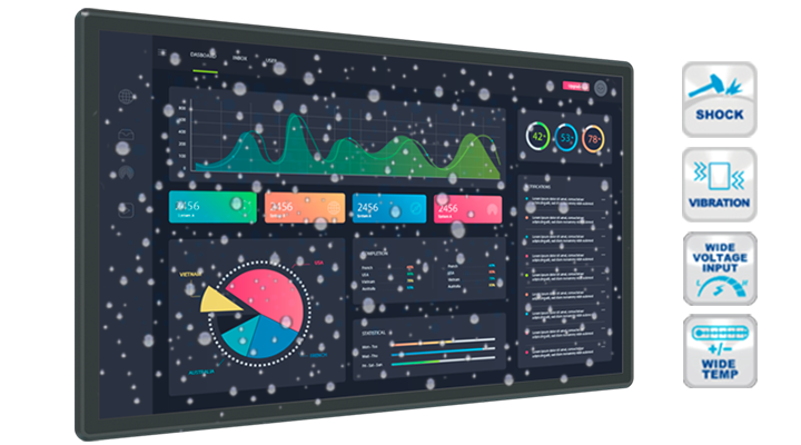 El HMI (Human Machine Interface) Industrial de 21,5" tiene una temperatura de operación de -10º a 60ºC, un voltaje de entrada ampliado de 9 - 48VDC, un sistema de protección contra corriente, voltaje y polaridad invertida. Además posee un diseño anti-golpes y anti-vibraciones (MIL-STD 810G) gracias a su carcasa sin ventiladores ni cables. Su protección industrial anti-agua y anti-polvo es IP65 en el frontal. El táctil capacitivo proyectado de nueva generación soporta uso con guantes, ralladuras y golpes. Siempre seguirá funcionando aunque este rayado o estropeado el táctil.